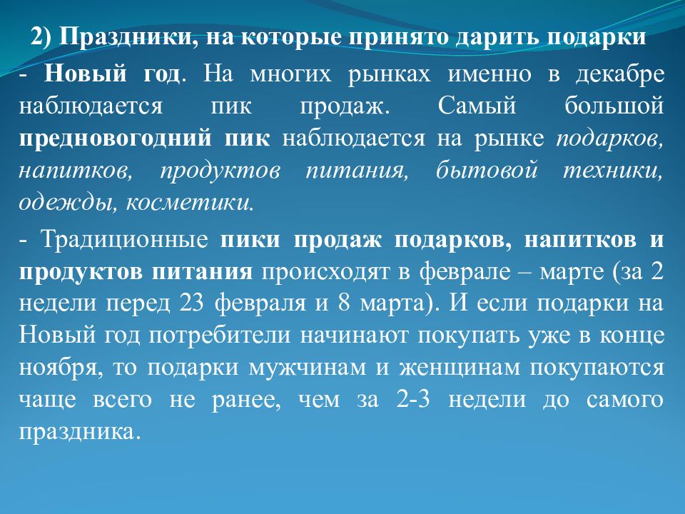 2) Праздники, на которые принято дарить подарки - Новый год. На многих рынках именно в декабре наблюдается пик продаж. Самый большой предновогодний пик наблюдается на рынке подарков, напитков, продуктов питания, бытовой техники, одежды, косметики. - Традиционные пики продаж подарков, напитков и продуктов питания происходят в феврале – марте (за 2 недели перед 23 февраля и 8 марта). И если подарки на Новый год потребители начинают покупать уже в конце ноября, то подарки мужчинам и женщинам покупаются чаще всего не ранее, чем за 2-3 недели до самого праздника.