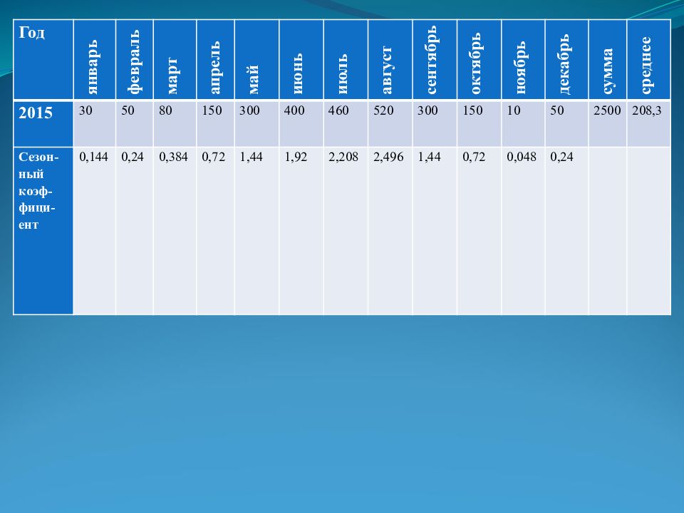 Год январь февраль март апрель май июнь июль август сентябрь октябрь ноябрь декабрь сумма среднее 2015 30 50 80 150 300 400 460 520 300 150 10 50 2500 208,3 Сезон- ный коэф-фици-ент 0,144 0,24 0,384 0,72 1,44 1,92 2,208 2,496 1,44 0,72 0,048 0,24