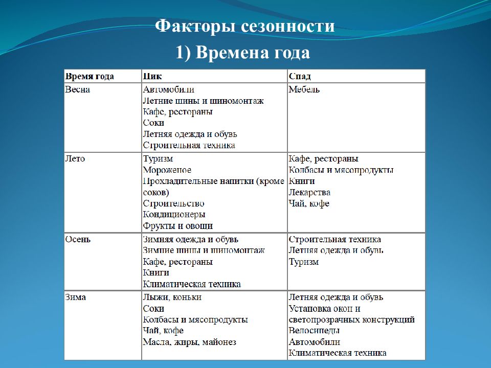 6) В силу привычек Некоторые сезонные колебания спроса мало связаны со всеми перечисленными факторами и скорее относятся к категории потребительских привычек и устоявшихся мнений. Например, распространены такие рассуждения: «кто же покупает машину зимой, это надо делать весной» или «ремонт лучше делать осенью, отдохнуть спокойно, а потом уж до нового года заниматься квартирой». На практике чаще всего бывает, что различные виды сезонности накладываются друг на друга, иногда приводя к сглаживанию спадов и пиков, а иногда наоборот их усиливая.