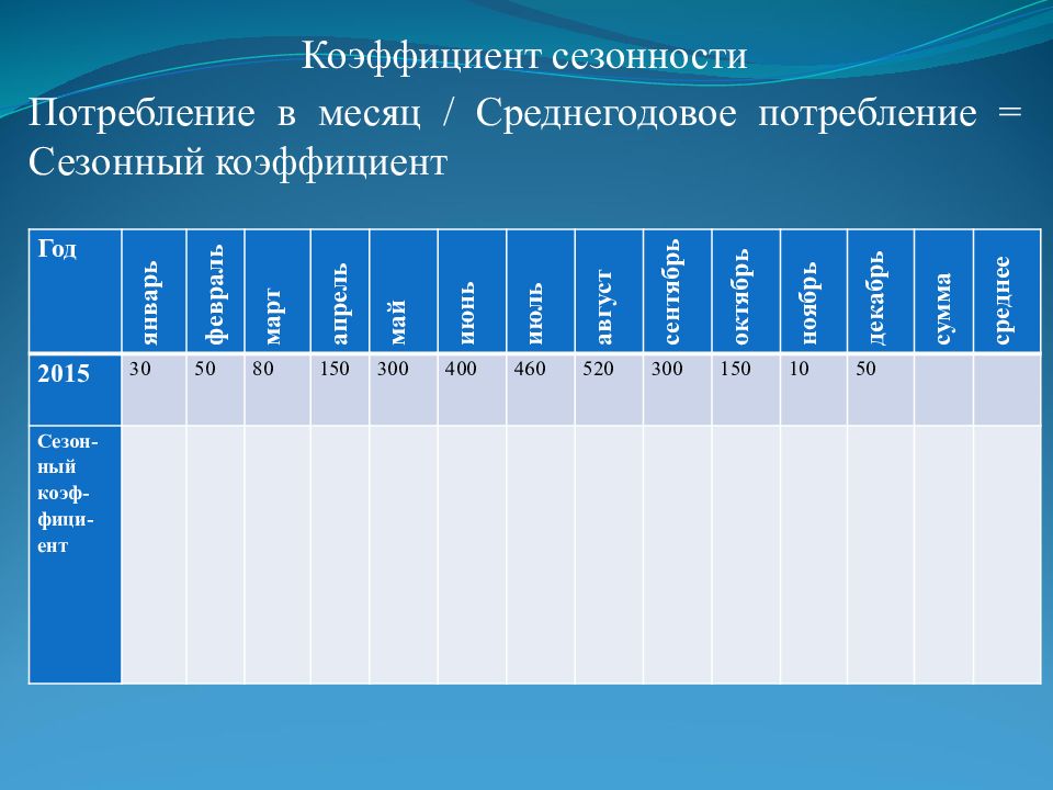 Коэффициент сезонности Потребление в месяц / Среднегодовое потребление = Сезонный коэффициент Год январь февраль март апрель май июнь июль август сентябрь октябрь ноябрь декабрь сумма среднее 2015 30 50 80 150 300 400 460 520 300 150 10 50 Сезон- ный коэф-фици-ент