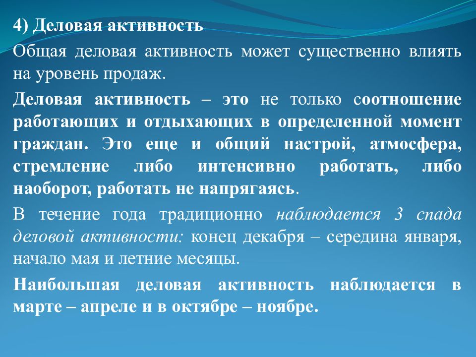 4) Деловая активность Общая деловая активность может существенно влиять на уровень продаж. Деловая активность – это не только с оотношение работающих и отдыхающих в определенной момент граждан. Это еще и общий настрой, атмосфера, стремление либо интенсивно работать, либо наоборот, работать не напрягаясь. В течение года традиционно наблюдается 3 спада деловой активности: конец декабря – середина января, начало мая и летние месяцы. Наибольшая деловая активность наблюдается в марте – апреле и в октябре – ноябре.
