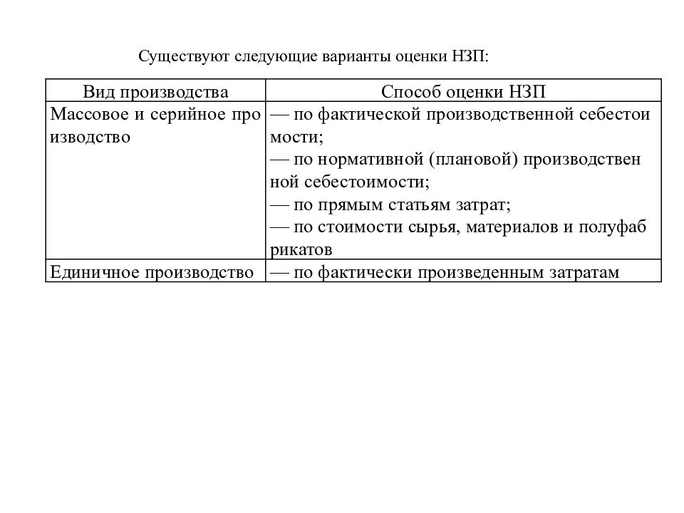 Вид производства Способ оценки НЗП Массовое и серийное производство — по фактической производственной себестоимости; — по нормативной (плановой) производственной себестоимости; — по прямым статьям затрат; — по стоимости сырья, материалов и полуфабрикатов Единичное производство — по фактически произведенным затратам Существуют следующие варианты оценки НЗП: