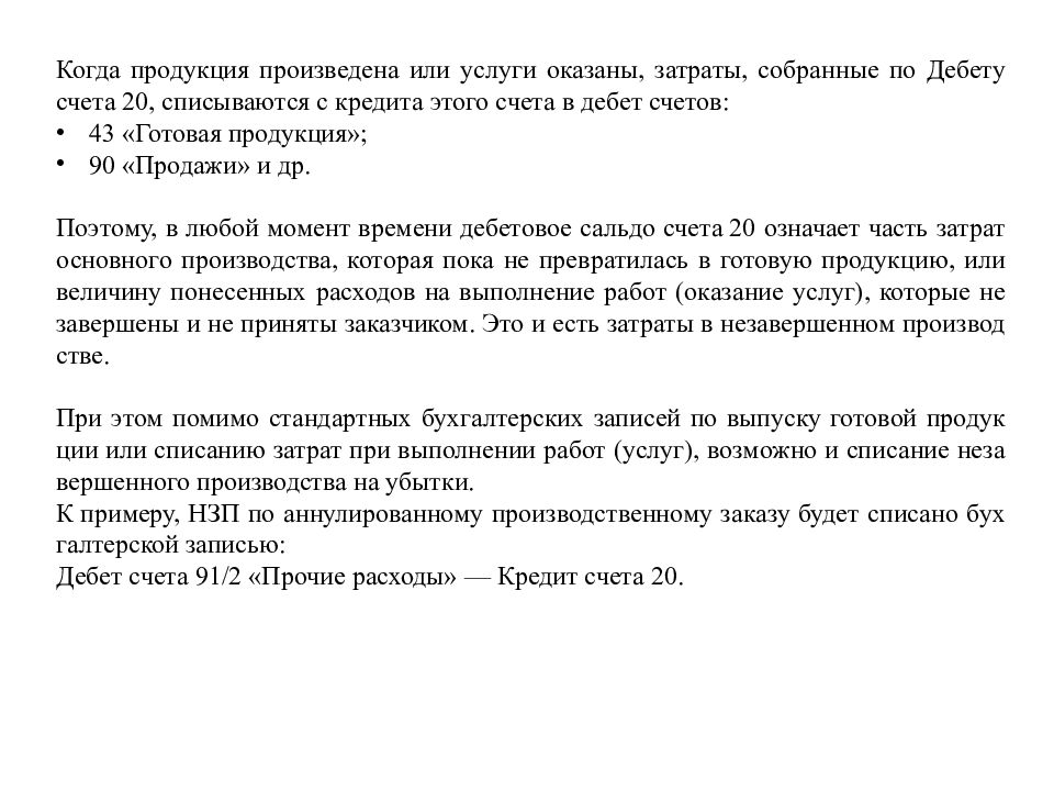 Когда продукция произведена или услуги оказаны, затраты, собранные по Дебету счета 20, списываются с кредита этого счета в дебет счетов: 43 «Готовая продукция»; 90 «Продажи» и др. Поэтому, в любой момент времени дебетовое сальдо счета 20 означает часть затрат основного производства, которая пока не превратилась в готовую продукцию, или величину понесенных расходов на выполнение работ (оказание услуг), которые не завершены и не приняты заказчиком. Это и есть затраты в незавершенном производстве. При этом помимо стандартных бухгалтерских записей по выпуску готовой продукции или списанию затрат при выполнении работ (услуг), возможно и списание незавершенного производства на убытки. К примеру, НЗП по аннулированному производственному заказу будет списано бухгалтерской записью: Дебет счета 91/2 «Прочие расходы» — Кредит счета 20.