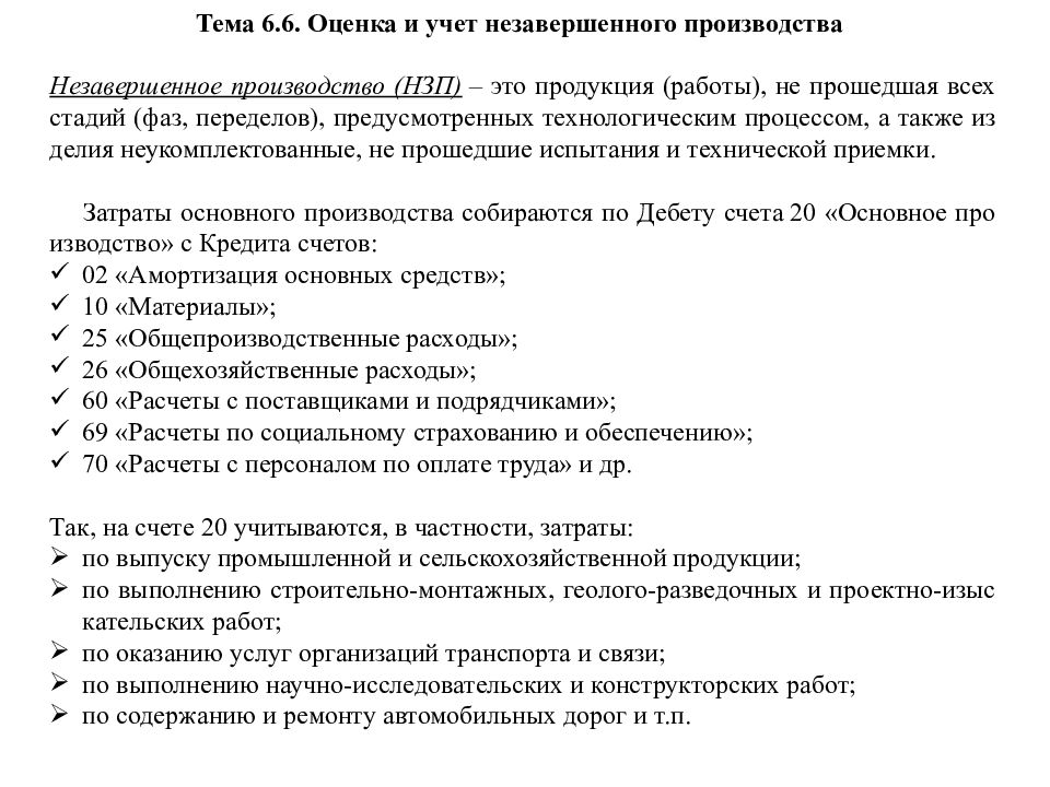 Тема 6.6. Оценка и учет незавершенного производства Незавершенное производство (НЗП) – это продукция (работы), не прошедшая всех стадий (фаз, переделов), предусмотренных технологическим процессом, а также изделия неукомплектованные, не прошедшие испытания и технической приемки. Затраты основного производства собираются по Дебету счета 20 «Основное производство» с Кредита счетов: 02 «Амортизация основных средств»; 10 «Материалы»; 25 «Общепроизводственные расходы»; 26 «Общехозяйственные расходы»; 60 «Расчеты с поставщиками и подрядчиками»; 69 «Расчеты по социальному страхованию и обеспечению»; 70 «Расчеты с персоналом по оплате труда» и др. Так, на счете 20 учитываются, в частности, затраты: по выпуску промышленной и сельскохозяйственной продукции; по выполнению строительно-монтажных, геолого-разведочных и проектно-изыскательских работ; по оказанию услуг организаций транспорта и связи; по выполнению научно-исследовательских и конструкторских работ; по содержанию и ремонту автомобильных дорог и т.п.