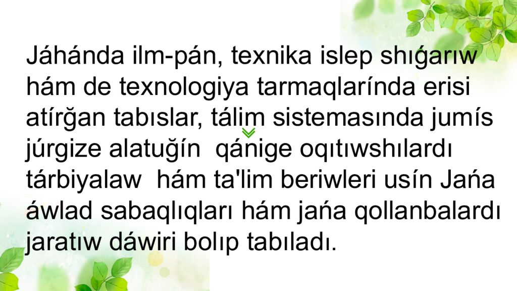 Jáhánda ilm-pán, texnika islep shıǵarıw hám de texnologiya tarmaqlar í nda erisi at í r ğ an tabıslar, tálim sistemasında jum í s júrgize alatu ğí n qánige oqıtıwshılardı tárbiyalaw h á m ta'lim beriwleri us í n Jańa áwlad sabaqlıqları hám jańa qollanbalardı jaratıw dáwiri bolıp tabılad ı.