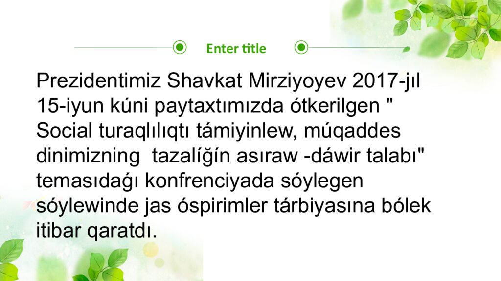 Enter title Prezidentimiz Shavkat Mirziyoyev 2017-jıl 15-iyun kúni paytaxtımızda ótkerilgen " Social turaqlılıqtı támiyinlew, múqaddes dinimizning tazal íğí n asıraw -dáwir talabı" temasıdaǵı konfrenciyada sóylegen sóylewinde jas ó spirimler tárbiyasına bólek itibar qaratdı.