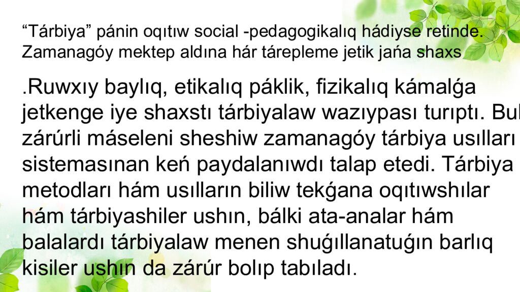 “Tárbiya” pánin oqıtıw social -pedagogikalıq hádiyse retinde. Zamanagóy mektep aldına hár tárepleme jetik jańa shaxs . Ruwxıy baylıq, etikalıq páklik, fizikalıq kámalǵa jetkenge iye shaxstı tárbiyalaw wazıypası turıptı. Bul zárúrli máseleni sheshiw zamanagóy tárbiya usılları sistemasınan keń paydalanıwdı talap etedi. Tárbiya metodları hám usılların biliw tekǵana oqıtıwshılar hám tárbiyashiler ushın, bálki ata-analar hám balalardı tárbiyalaw menen shuǵıllanatuǵın barlıq kisiler ushın da zárúr bolıp tabıladı.