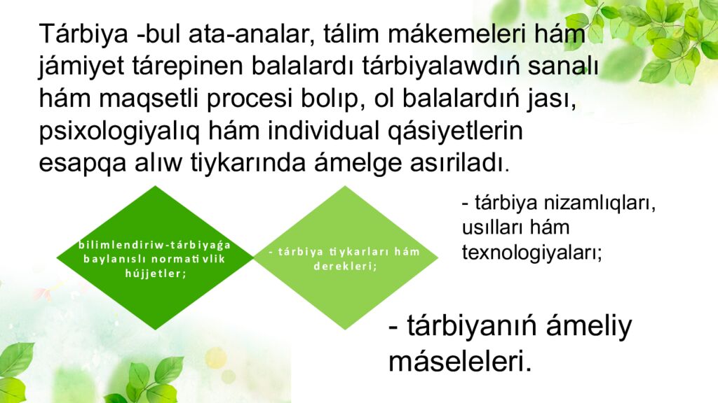 - tárbiya tiykarları hám derekleri; bilimlendiriw-tárbiyaǵa baylanıslı normativlik hújjetler; Tárbiya -bul ata-analar, tálim mákemeleri hám jámiyet tárepinen balalardı tárbiyalawdıń sanalı hám maqsetli procesi bolıp, ol balalardıń jası, psixologiyalıq hám individual qásiyetlerin esapqa alıw tiykarında ámelge asıriladı. - tárbiya nizamlıqları, usılları hám texnologiyaları; - tárbiyanıń ámeliy máseleleri.