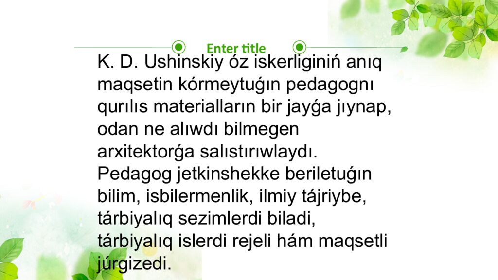Enter title K. D. Ushinskiy óz iskerliginiń anıq maqsetin kórmeytuǵın pedagognı qurılıs materialların bir jayǵa jıynap, odan ne alıwdı bilmegen arxitektorǵa salıstırıwlaydı. Pedagog jetkinshekke beriletuǵın bilim, isbilermenlik, ilmiy tájriybe, tárbiyalıq sezimlerdi biladi, tárbiyalıq islerdi rejeli hám maqsetli júrgizedi.