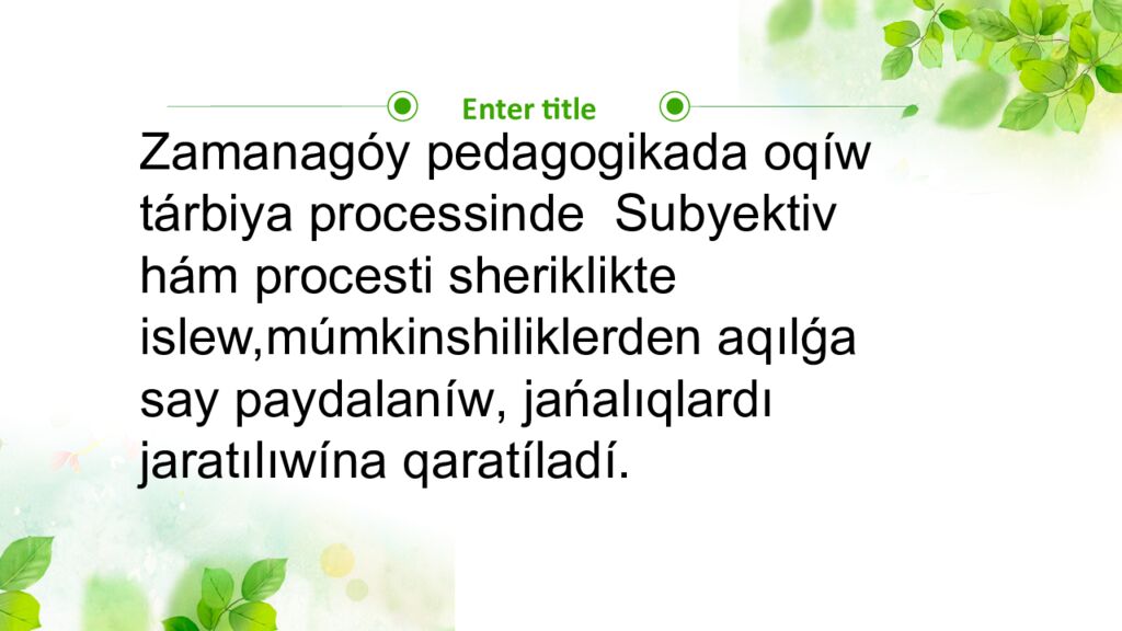 Enter title Zamanagóy p edagogikada oq í w tárbiya processinde Subyektiv hám procesti sheriklikte islew, múmkinshiliklerden aqılǵa say paydalan í w, jańalıqlardı jaratılıw í na qarat í lad í.