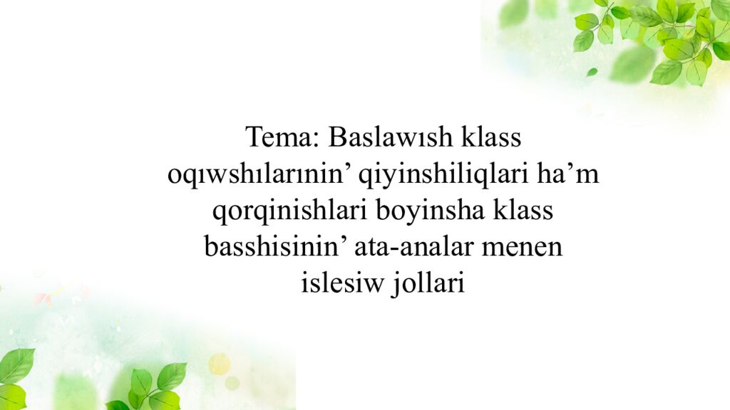 Tema : Bas lawısh klass oqıwshıların in’ qiyinshiliqlari ha’m qorqinishlari boyinsha klass basshisinin ’ ata -analar menen islesiw jollari