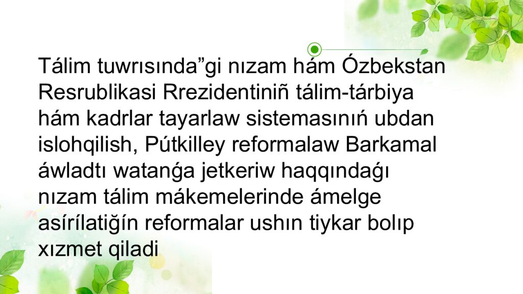 Tálim tuwrısında”gi nızam h á m Ózbekstan Resrublikasi Rrezidentini ñ tálim-tárbiya h á m kadrlar tayarlaw sistemasınıń ubdan islohqilish, Pútkilley reformalaw Barkamal áwladtı watanǵa jetkeriw haqqındaǵı nızam tálim mákemelerinde á melge as í r í lati ğí n reformalar ushın tiykar bolıp xızmet qiladi