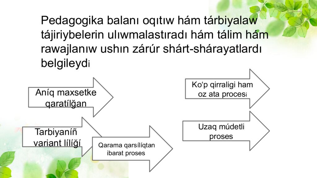 Pedagogika balanı oqıtıw hám tárbiyalaw tájiriybelerin ulıwmalastıradı hám tálim hám rawajlanıw ushın zárúr shárt-shárayatlardı belgileyd i An í q maxsetke qarat í l ğ an Tarbiyan íñ variant l í l íğí Koʻp qirraligi ham oz ata proces i Uzaq m ú detli proses Qarama qars í l í qtan ibarat proses