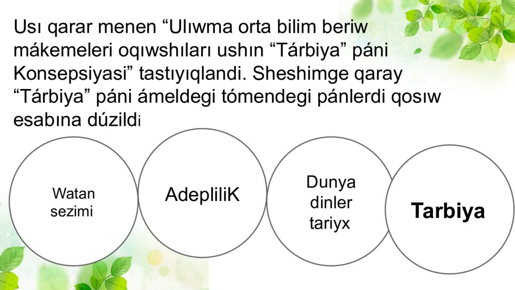 Usı qarar menen “Ulıwma orta bilim beriw mákemeleri oqıwshıları ushın “Tárbiya” páni Konsepsiyasi” tastıyıqlandi. Sheshimge qaray “Tárbiya” páni ámeldegi tómendegi pánlerdi qosıw esabına dúzild i Watan sezimi AdepliliK Dunya dinler tariyx Tarbiya
