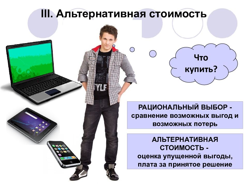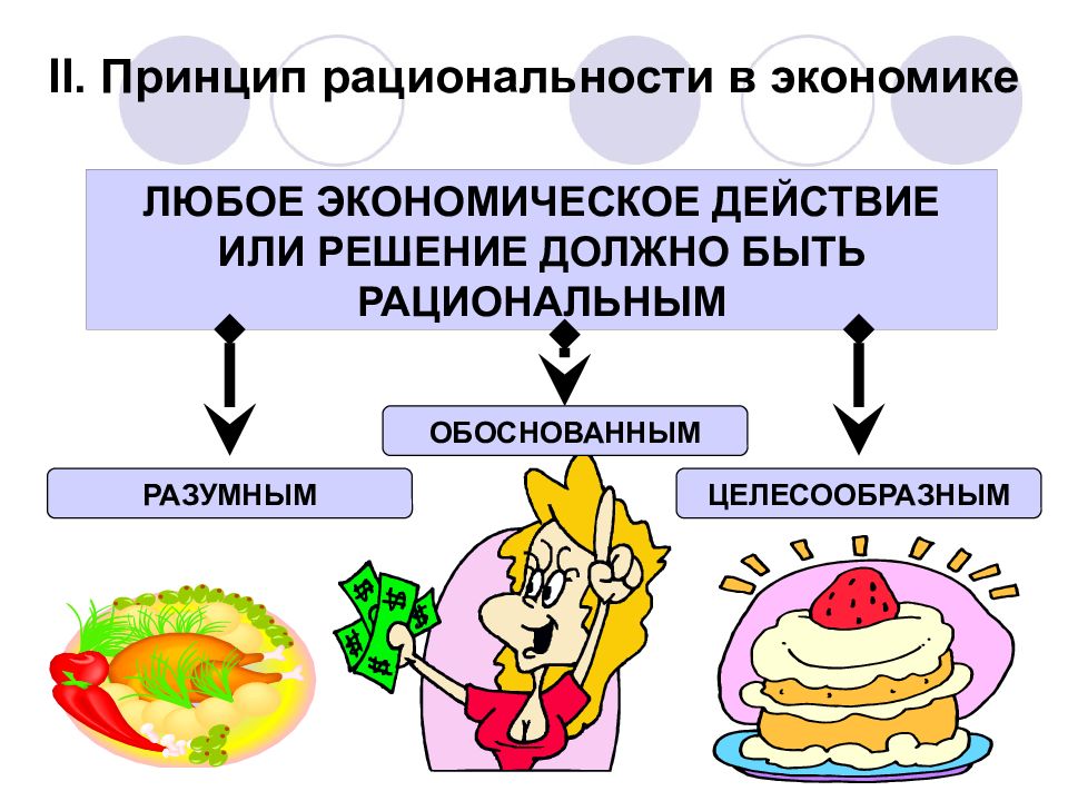 РАЦИОНАЛЬНЫЙ ПОТРЕБИТЕЛЬ Какие товары или услуги необходимы Где можно купить товар или услугу Какие цены существуют на данный товар или услугу Каково качество товара или услуги, которые вы собираетесь приобрести Осознает потребность в покупке Ищет информацию о товаре Оценивает покупку с точки зрения экономии средств Старается приобрести качественный товар длительного пользования II. Принцип рациональности в экономике