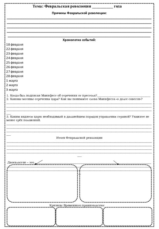 Причины Февральской революции: _________________________________________________________________________________________________________________________________________________________________________________________________________________________________________________________________________________________________________________________________________________________________________________________________________________________ Хронология событий : 18 февраля 22 февраля 23 февраля 24 февраля 25 февраля 26 февраля 27 февраля 28 февраля 1 марта 2 марта 3 марта 1. Когда был подписан Манифест об отречении от престола ?____________________________________ 2. Каковы мотивы отречения царя? Как вы понимаете слова Манифеста «о долге совести»? _________________________________________________________________________________________________________________________________________________________________________________________________________________________________________________________________________________________________________ 3. Каким видится царю необходимый в дальнейшем порядок управления страной? Укажите не менее трёх положений. _________________________________________________________________________________________________________________________________________________________________________________________________________________________________________________________________________________________________________ Итоги Февральской революции ___________________________________________________________________________________________________________________________________________________________________________________________________________________________________________________________________________________________________________________________________________________________________________________________________________ Двоевластие – это_______________________________________________________________________________ ______________________________________________________________________________________________________________________________________________________________________________________________________ Кризисы Временного правительства: