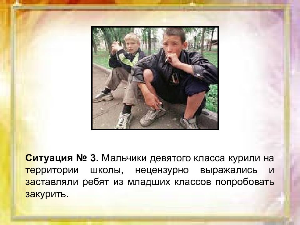 Ситуация № 3. Мальчики девятого класса курили на территории школы, нецензурно выражались и заставляли ребят из младших классов попробовать закурить.