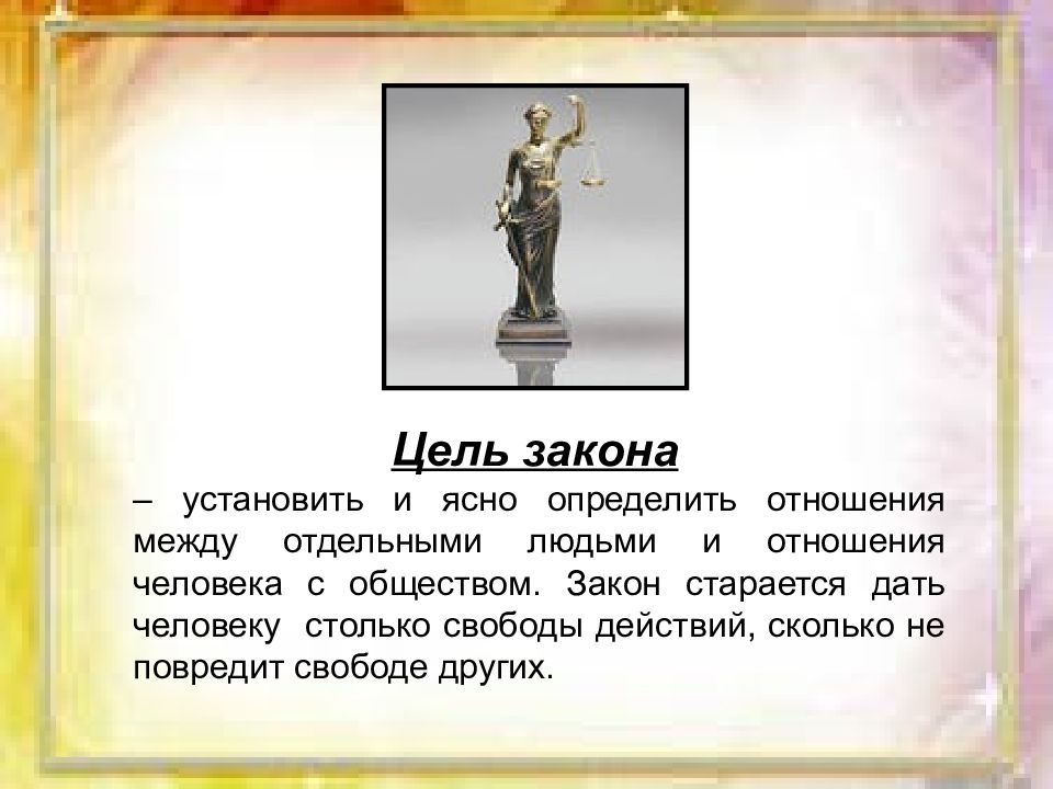 Цель закона – установить и ясно определить отношения между отдельными людьми и отношения человека с обществом. Закон старается дать человеку столько свободы действий, сколько не повредит свободе других.