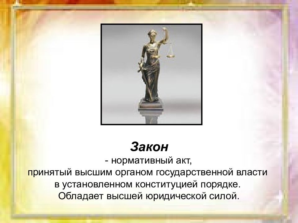 Закон - нормативный акт, принятый высшим органом государственной власти в установленном конституцией порядке. Обладает высшей юридической силой.