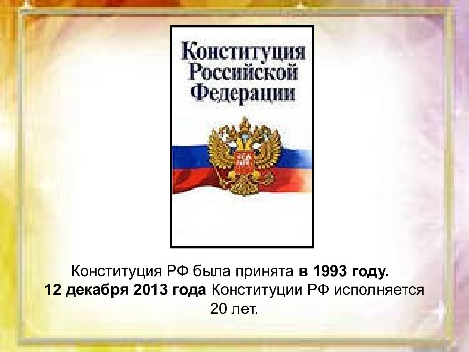 Конституция РФ была принята в 1993 году. 12 декабря 2013 года Конституции РФ исполняется 20 лет.