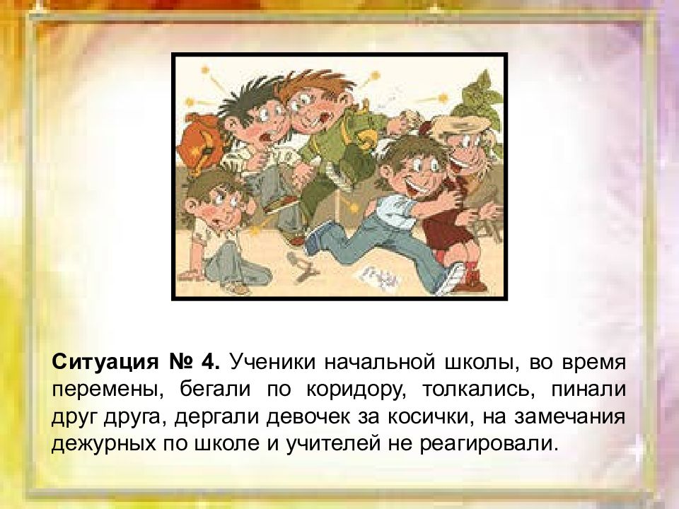 Ситуация № 4. Ученики начальной школы, во время перемены, бегали по коридору, толкались, пинали друг друга, дергали девочек за косички, на замечания дежурных по школе и учителей не реагировали.