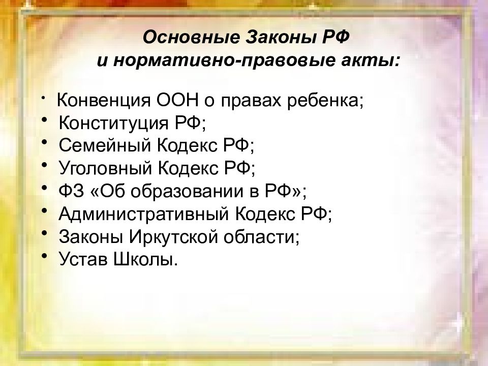 Основные Законы РФ и нормативно-правовые акты: Конвенция ООН о правах ребенка; Конституция РФ; Семейный Кодекс РФ; Уголовный Кодекс РФ; ФЗ «Об образовании в РФ»; Административный Кодекс РФ; Законы Иркутской области; Устав Школы.