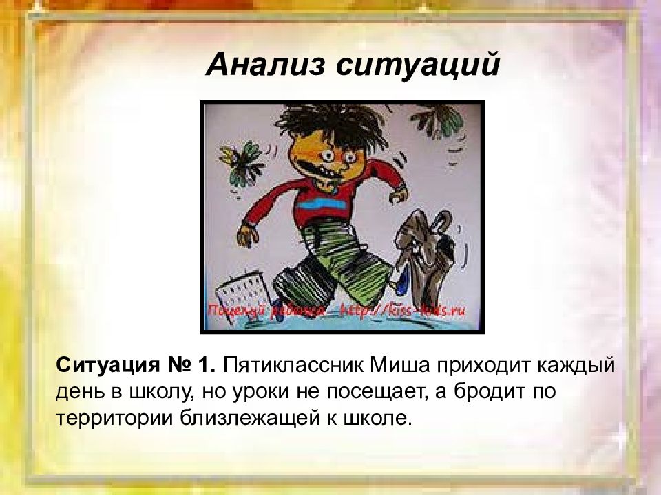 Анализ ситуаций Ситуация № 1. Пятиклассник Миша приходит каждый день в школу, но уроки не посещает, а бродит по территории близлежащей к школе.