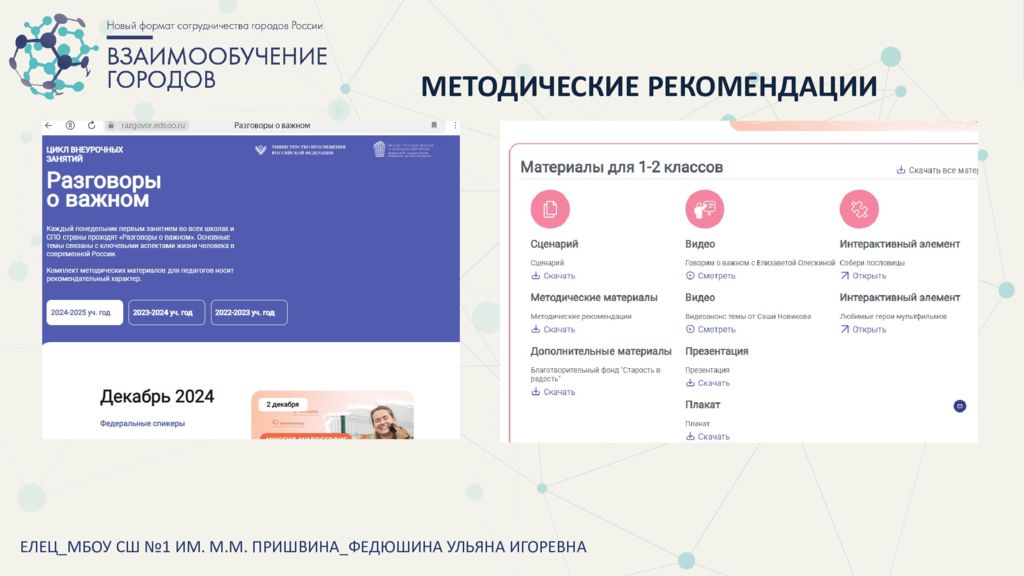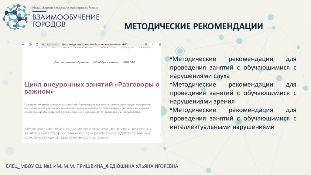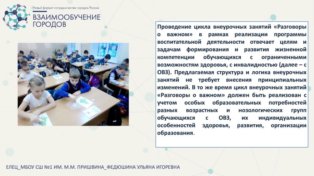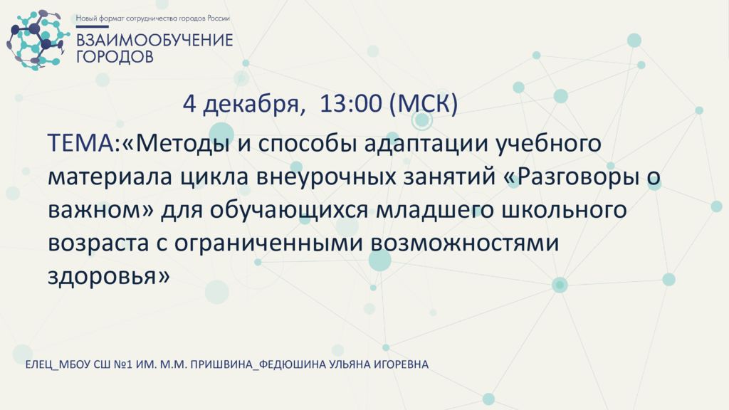 ТЕМА :«Методы и способы адаптации учебного материала цикла внеурочных занятий «Разговоры о важном» для обучающихся младшего школьного возраста с ограниченными возможностями здоровья » 4 декабря, 13:00 (МСК) ЕЛЕЦ_МБОУ СШ №1 ИМ. М.М. ПРИШВИНА_ФЕДЮШИНА УЛЬЯНА ИГОРЕВНА