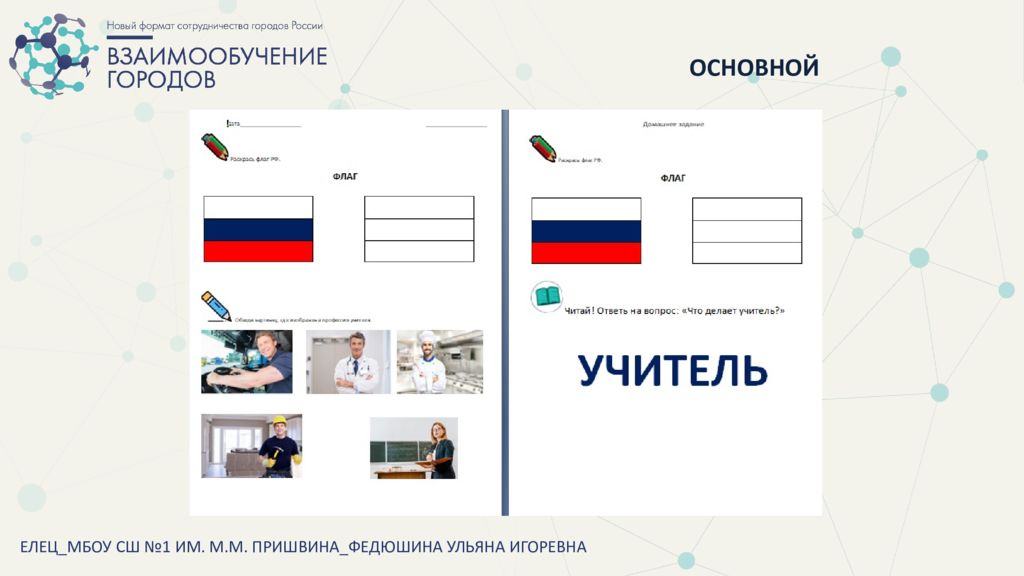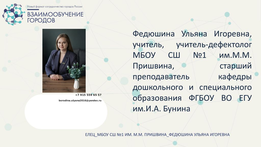 Федюшина Ульяна Игоревна, учитель, учитель-дефектолог МБОУ СШ №1 им.М.М. Пришвина, старший преподаватель кафедры дошкольного и специального образования ФГБОУ ВО ЕГУ им.И.А. Бунина ЕЛЕЦ_МБОУ СШ №1 ИМ. М.М. ПРИШВИНА_ФЕДЮШИНА УЛЬЯНА ИГОРЕВНА +7 915 559 65 57 borodina.ulyana2016@yandex.ru