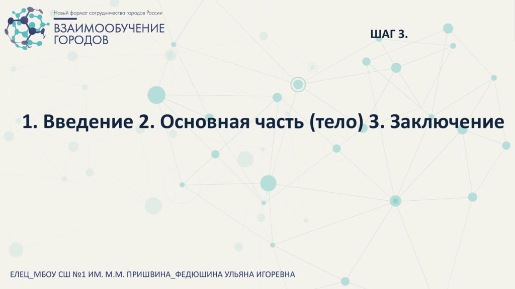 ЕЛЕЦ_МБОУ СШ №1 ИМ. М.М. ПРИШВИНА_ФЕДЮШИНА УЛЬЯНА ИГОРЕВНА ШАГ 3. 1. Введение 2. Основная часть (тело) 3. Заключение