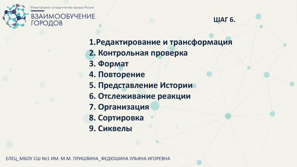 ЕЛЕЦ_МБОУ СШ №1 ИМ. М.М. ПРИШВИНА_ФЕДЮШИНА УЛЬЯНА ИГОРЕВНА ШАГ 6. 1.Редактирование и трансформация 2. Контрольная проверка 3. Формат 4. Повторение 5. Представление Истории 6. Отслеживание реакции 7. Организация 8. Сортировка 9. Сиквелы