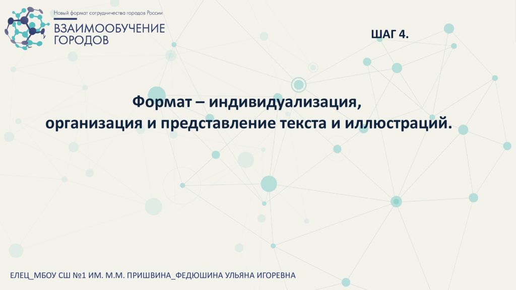 ЕЛЕЦ_МБОУ СШ №1 ИМ. М.М. ПРИШВИНА_ФЕДЮШИНА УЛЬЯНА ИГОРЕВНА ШАГ 4. Формат – индивидуализация, организация и представление текста и иллюстраций.