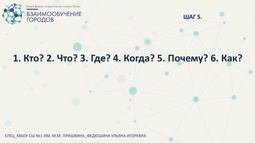 ЕЛЕЦ_МБОУ СШ №1 ИМ. М.М. ПРИШВИНА_ФЕДЮШИНА УЛЬЯНА ИГОРЕВНА ШАГ 5. 1. Кто? 2. Что? 3. Где? 4. Когда? 5. Почему? 6. Как?