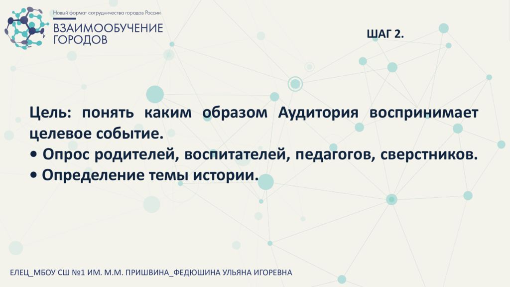 ЕЛЕЦ_МБОУ СШ №1 ИМ. М.М. ПРИШВИНА_ФЕДЮШИНА УЛЬЯНА ИГОРЕВНА ШАГ 2. Цель: понять каким образом Аудитория воспринимает целевое событие. • Опрос родителей, воспитателей, педагогов, сверстников. • Определение темы истории.