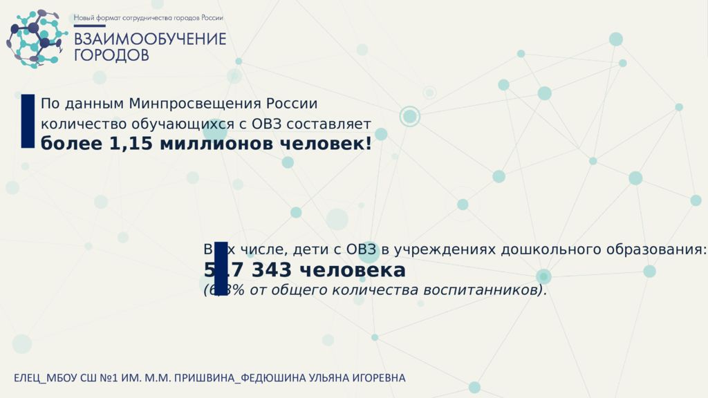ЕЛЕЦ_МБОУ СШ №1 ИМ. М.М. ПРИШВИНА_ФЕДЮШИНА УЛЬЯНА ИГОРЕВНА По данным Минпросвещения России количество обучающихся с ОВЗ составляет более 1,15 миллионов человек! В их числе, дети с ОВЗ в учреждениях дошкольного образования: 517 343 человека (6,8% от общего количества воспитанников).