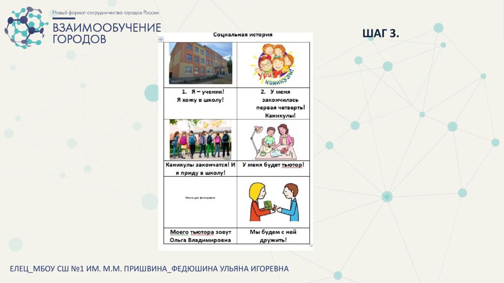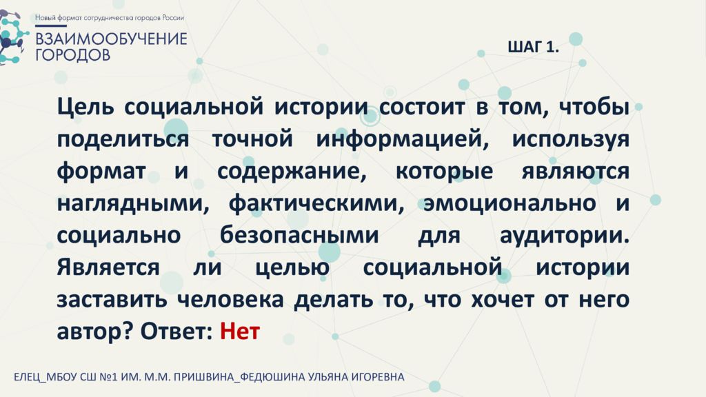 ЕЛЕЦ_МБОУ СШ №1 ИМ. М.М. ПРИШВИНА_ФЕДЮШИНА УЛЬЯНА ИГОРЕВНА Цель социальной истории состоит в том, чтобы поделиться точной информацией, используя формат и содержание, которые являются наглядными, фактическими, эмоционально и социально безопасными для аудитории. Является ли целью социальной истории заставить человека делать то, что хочет от него автор? Ответ: Нет ШАГ 1.