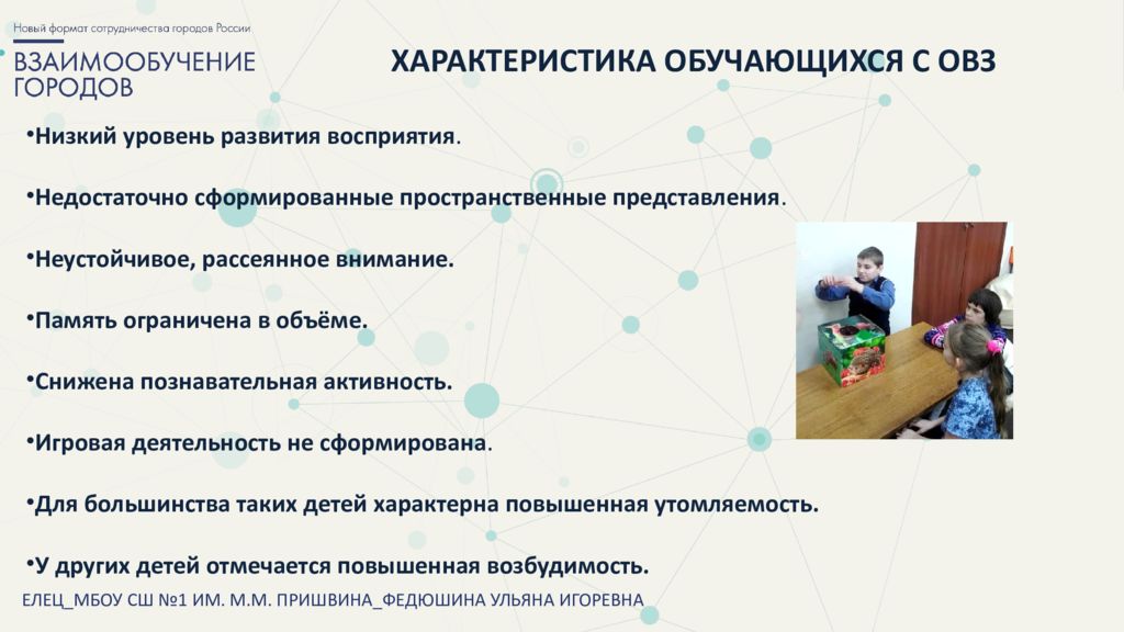 ЕЛЕЦ_МБОУ СШ №1 ИМ. М.М. ПРИШВИНА_ФЕДЮШИНА УЛЬЯНА ИГОРЕВНА ХАРАКТЕРИСТИКА ОБУЧАЮЩИХСЯ С ОВЗ Низкий уровень развития восприятия. Недостаточно сформированные пространственные представления. Неустойчивое, рассеянное внимание. Память ограничена в объёме. Снижена познавательная активность. Игровая деятельность не сформирована. Для большинства таких детей характерна повышенная утомляемость. У других детей отмечается повышенная возбудимость.