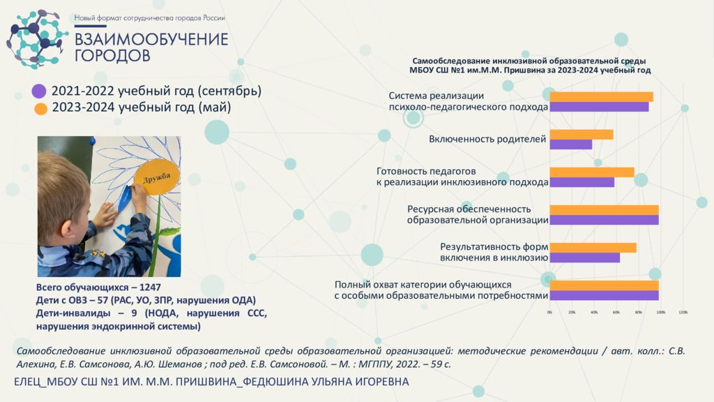 ЕЛЕЦ_МБОУ СШ №1 ИМ. М.М. ПРИШВИНА_ФЕДЮШИНА УЛЬЯНА ИГОРЕВНА 2021-2022 учебный год (сентябрь) 2023-2024 учебный год (май) Всего обучающихся – 1247 Дети с ОВЗ – 57 (РАС, УО, ЗПР, нарушения ОДА) Дети-инвалиды – 9 (НОДА, нарушения ССС, нарушения эндокринной системы) Самообследование инклюзивной образовательной среды образовательной организацией: методические рекомендации / авт. колл.: С.В. Алехина, Е.В. Самсонова, А.Ю. Шеманов ; под ред. Е.В. Самсоновой. – М. : МГППУ, 2022. ‒ 59 с.