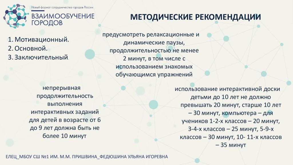 ЕЛЕЦ_МБОУ СШ №1 ИМ. М.М. ПРИШВИНА_ФЕДЮШИНА УЛЬЯНА ИГОРЕВНА Мотивационный. Основной. Заключительный. МЕТОДИЧЕСКИЕ РЕКОМЕНДАЦИИ непрерывная продолжительность выполнения интерактивных заданий для детей в возрасте от 6 до 9 лет должна быть не более 10 минут предусмотреть релаксационные и динамические паузы, продолжительностью не менее 2 минут, в том числе с использованием знакомых обучающимся упражнений использование интерактивной доски детьми до 10 лет не должно превышать 20 минут, старше 10 лет – 30 минут, компьютера – для учеников 1-2-х классов – 20 минут, 3-4-х классов – 25 минут, 5-9-х классов – 30 минут, 10- 11-х классов – 35 минут