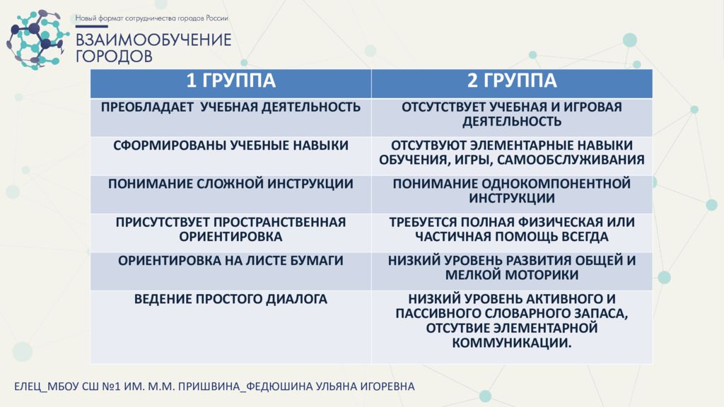ЕЛЕЦ_МБОУ СШ №1 ИМ. М.М. ПРИШВИНА_ФЕДЮШИНА УЛЬЯНА ИГОРЕВНА 1 ГРУППА 2 ГРУППА ПРЕОБЛАДАЕТ УЧЕБНАЯ ДЕЯТЕЛЬНОСТЬ ОТСУТСТВУЕТ УЧЕБНАЯ И ИГРОВАЯ ДЕЯТЕЛЬНОСТЬ СФОРМИРОВАНЫ УЧЕБНЫЕ НАВЫКИ ОТСУТВУЮТ ЭЛЕМЕНТАРНЫЕ НАВЫКИ ОБУЧЕНИЯ, ИГРЫ, САМООБСЛУЖИВАНИЯ ПОНИМАНИЕ СЛОЖНОЙ ИНСТРУКЦИИ ПОНИМАНИЕ ОДНОКОМПОНЕНТНОЙ ИНСТРУКЦИИ ПРИСУТСТВУЕТ ПРОСТРАНСТВЕННАЯ ОРИЕНТИРОВКА ТРЕБУЕТСЯ ПОЛНАЯ ФИЗИЧЕСКАЯ ИЛИ ЧАСТИЧНАЯ ПОМОЩЬ ВСЕГДА ОРИЕНТИРОВКА НА ЛИСТЕ БУМАГИ НИЗКИЙ УРОВЕНЬ РАЗВИТИЯ ОБЩЕЙ И МЕЛКОЙ МОТОРИКИ ВЕДЕНИЕ ПРОСТОГО ДИАЛОГА НИЗКИЙ УРОВЕНЬ АКТИВНОГО И ПАССИВНОГО СЛОВАРНОГО ЗАПАСА, ОТСУТВИЕ ЭЛЕМЕНТАРНОЙ КОММУНИКАЦИИ.