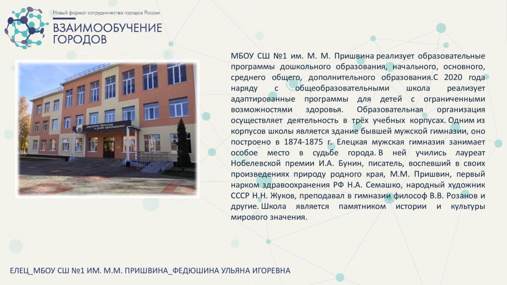 ЕЛЕЦ_МБОУ СШ №1 ИМ. М.М. ПРИШВИНА_ФЕДЮШИНА УЛЬЯНА ИГОРЕВНА МБОУ СШ №1 им. М. М. Пришвина реализует образовательные программы дошкольного образования, начального, основного, среднего общего, дополнительного образования.С 2020 года наряду с общеобразовательными школа реализует адаптированные программы для детей с ограниченными возможностями здоровья. Образовательная организация осуществляет деятельность в трёх учебных корпусах. Одним из корпусов школы является здание бывшей мужской гимназии, оно построено в 1874-1875 г. Елецкая мужская гимназия занимает особое место в судьбе города. В ней учились лауреат Нобелевской премии И.А. Бунин, писатель, воспевший в своих произведениях природу родного края, М.М. Пришвин, первый нарком здравоохранения РФ Н.А. Семашко, народный художник СССР Н.Н. Жуков, преподавал в гимназии философ В.В. Розанов и другие. Школа является памятником истории и культуры мирового значения.