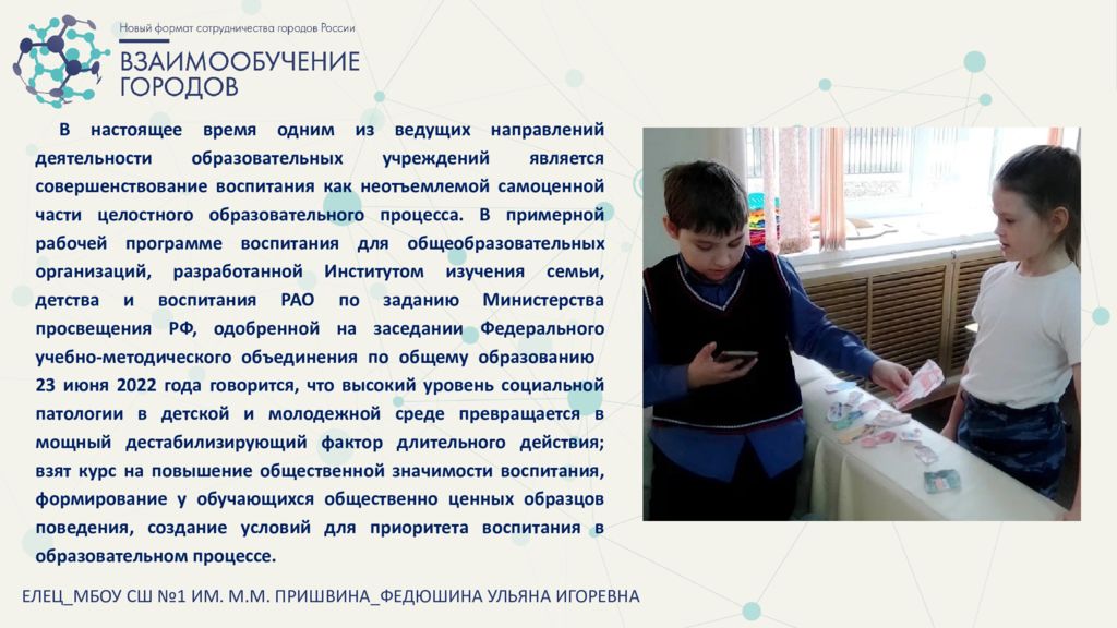 ЕЛЕЦ_МБОУ СШ №1 ИМ. М.М. ПРИШВИНА_ФЕДЮШИНА УЛЬЯНА ИГОРЕВНА В настоящее время одним из ведущих направлений деятельности образовательных учреждений является совершенствование воспитания как неотъемлемой самоценной части целостного образовательного процесса. В примерной рабочей программе воспитания для общеобразовательных организаций, разработанной Институтом изучения семьи, детства и воспитания РАО по заданию Министерства просвещения РФ, одобренной на заседании Федерального учебно-методического объединения по общему образованию 23 июня 2022 года говорится, что высокий уровень социальной патологии в детской и молодежной среде превращается в мощный дестабилизирующий фактор длительного действия; взят курс на повышение общественной значимости воспитания, формирование у обучающихся общественно ценных образцов поведения, создание условий для приоритета воспитания в образовательном процессе.
