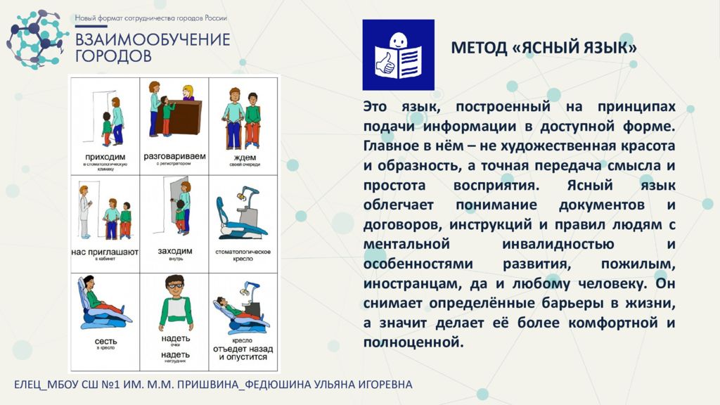 ЕЛЕЦ_МБОУ СШ №1 ИМ. М.М. ПРИШВИНА_ФЕДЮШИНА УЛЬЯНА ИГОРЕВНА Это язык, построенный на принципах подачи информации в доступной форме. Главное в нём – не художественная красота и образность, а точная передача смысла и простота восприятия. Ясный язык облегчает понимание документов и договоров, инструкций и правил людям с ментальной инвалидностью и особенностями развития, пожилым, иностранцам, да и любому человеку. Он снимает определённые барьеры в жизни, а значит делает её более комфортной и полноценной. МЕТОД «ЯСНЫЙ ЯЗЫК»