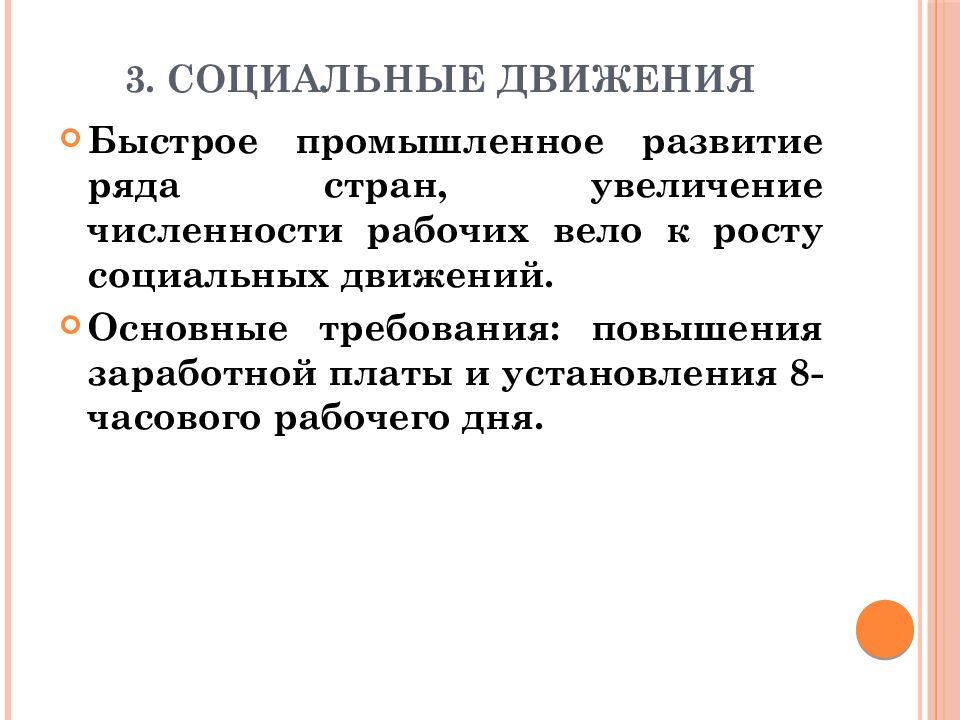 Быстрое промышленное развитие ряда стран, увеличение численности рабочих вело к росту социальных движений. Основные требования: повышения заработной платы и установления 8-часового рабочего дня.