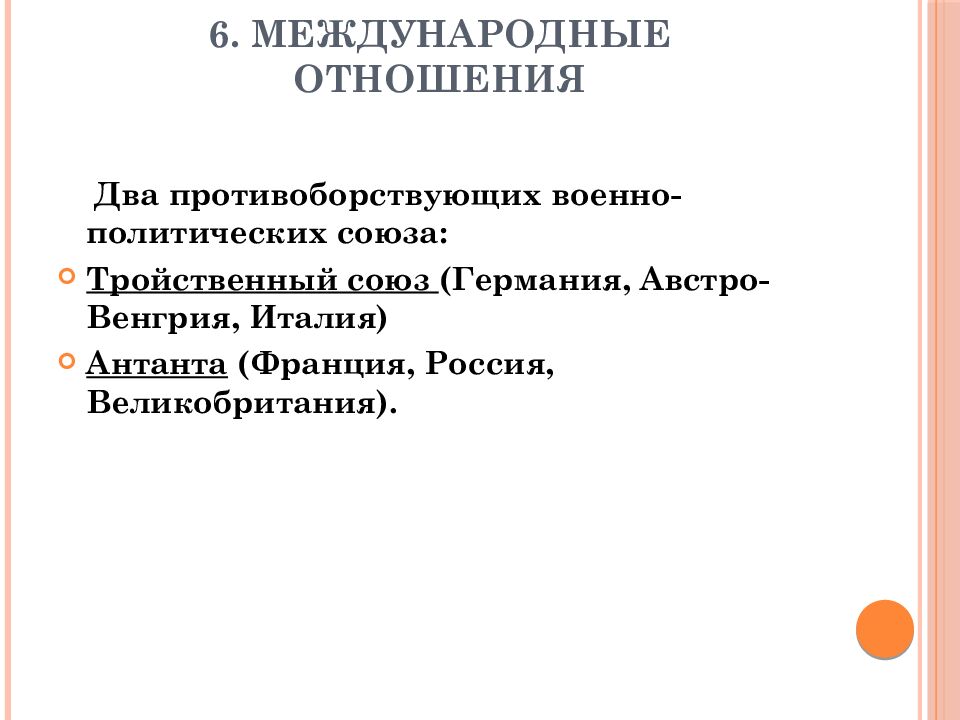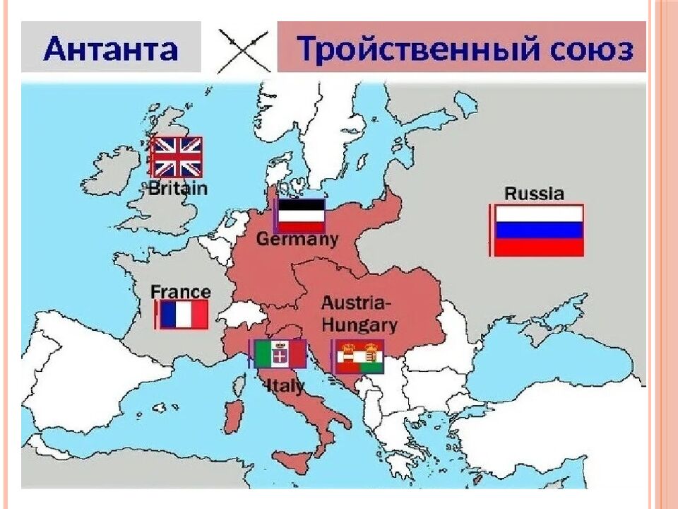 Два противоборствующих военно-политических союза: Тройственный союз (Германия, Австро-Венгрия, Италия) Антанта (Франция, Россия, Великобритания).