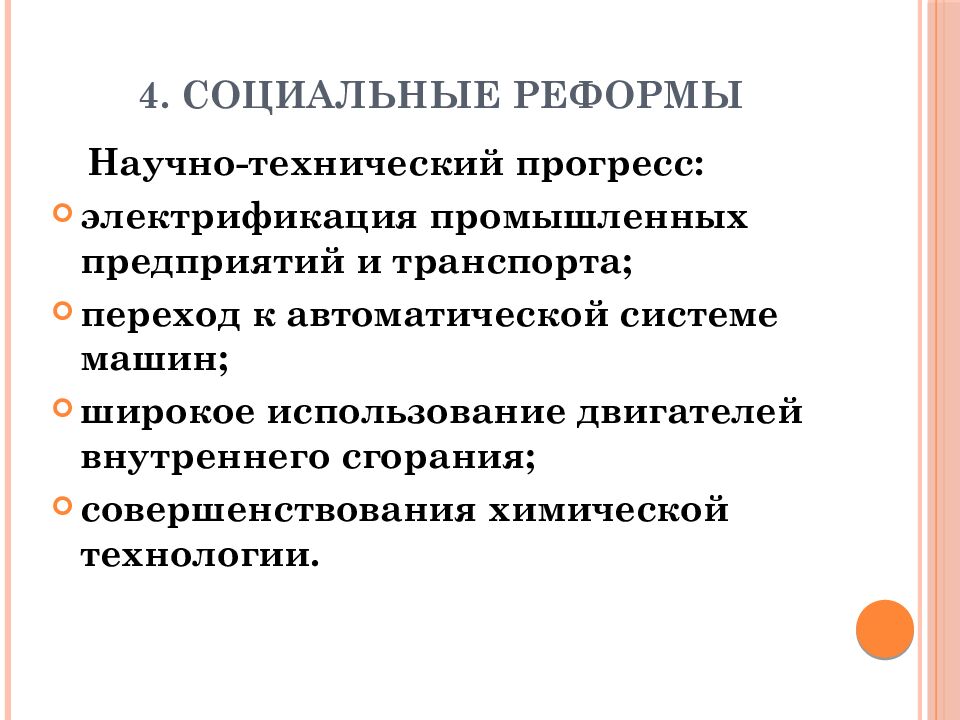 Научно-технический прогресс: электрификация промышленных предприятий и транспорта; переход к автоматической системе машин; широкое использование двигателей внутреннего сгорания; совершенствования химической технологии.