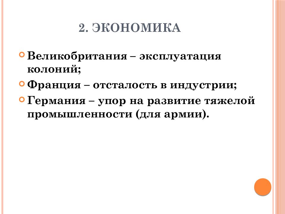 Великобритания – эксплуатация колоний; Франция – отсталость в индустрии; Германия – упор на развитие тяжелой промышленности (для армии).