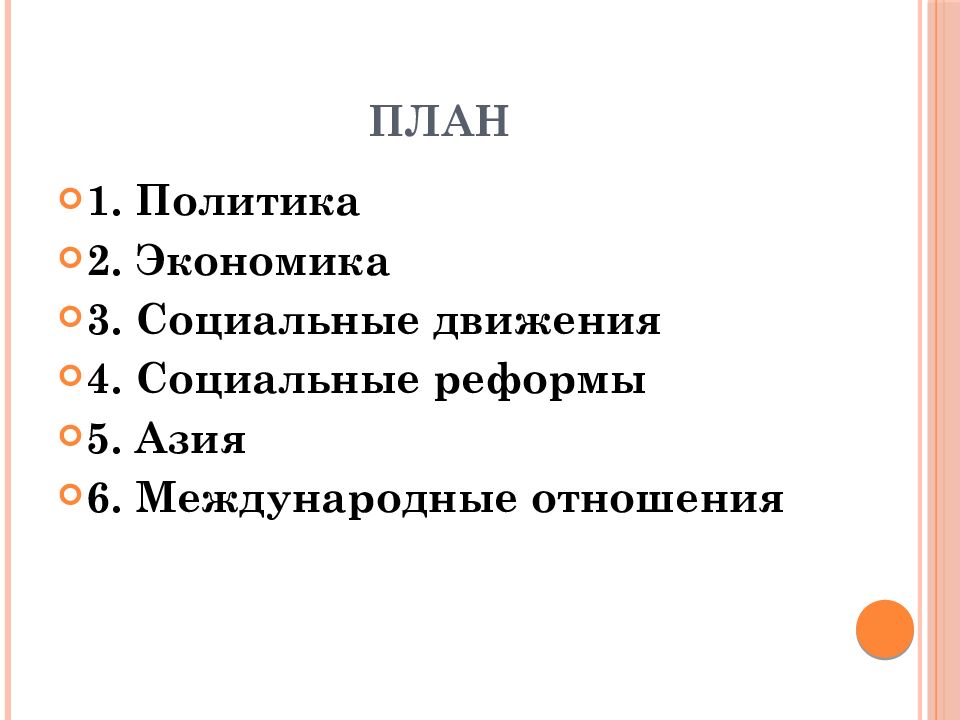 1. Политика 2. Экономика 3. Социальные движения 4. Социальные реформы 5. Азия 6. Международные отношения