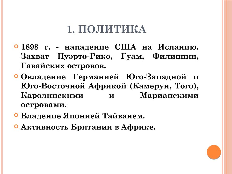 1898 г. - нападение США на Испанию. Захват Пуэрто-Рико, Гуам, Филиппин, Гавайских островов. Овладение Германией Юго-Западной и Юго-Восточной Африкой (Камерун, Того), Каролинскими и Марианскими островами. Владение Японией Тайванем. Активность Британии в Африке.