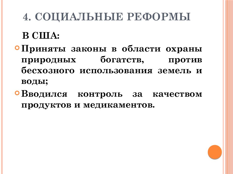 В США: Приняты законы в области охраны природных богатств, против бесхозного использования земель и воды; Вводился контроль за качеством продуктов и медикаментов.
